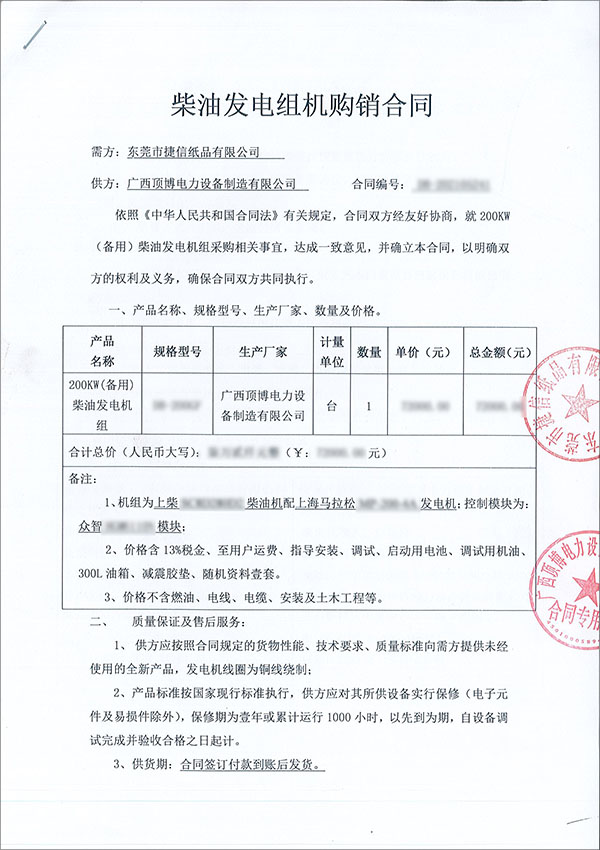 与东莞市捷信纸品有限公司成功签订一台200kw上柴柴油发电机组,该台机组将作为备用电源,在市电停电时能迅速为贵公司提供稳定的交流电源,保证生产工作不受影响。