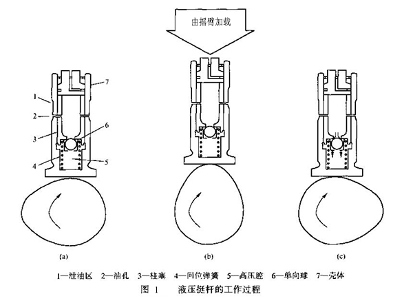 凸轮凸部举升之前的情况如图1(a) 所示,在凸轮凸部开始举升之前,柱塞被内部回位弹簧向上顶起。机油从挺杆腔流向凹进部位,称为泄油区;挺杆内的机油压力来自发动机的润滑系统。此时,高压腔内充满了机油,气门机构中的所有间隙都被机油压力消除。机油要通过单向球,此单向球只允许机油向一个方向通过。如果机油试图从高压进人柱塞,将被单向球截止。一些挺杆采用单向阀而不是单向球,但原理是相同的。