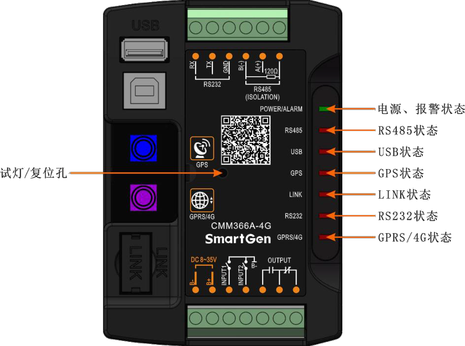 灭:CMM366A-4G 模块与服务器未注册成功; 亮:与服务器注册成功; 闪烁:实时数据通信正常。 |
